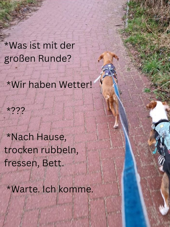 Mit Dobby hatte ich so Tage auch. Aber jetzt sind es zwei. Eine neue Herausforderung, denn Dobby macht mit, weist Luna in die Schranken oder schimpft lautstark mit mir, weil ich der Kleinen scheinbar alles durchgehen lasse? Ich weiß es nicht genau. Ist auch egal. Es ist auf jeden Fall wild und laut. Zuschauer gibt es gratis und ich spüre die Blicke. Was es irgendwie nicht besser macht.